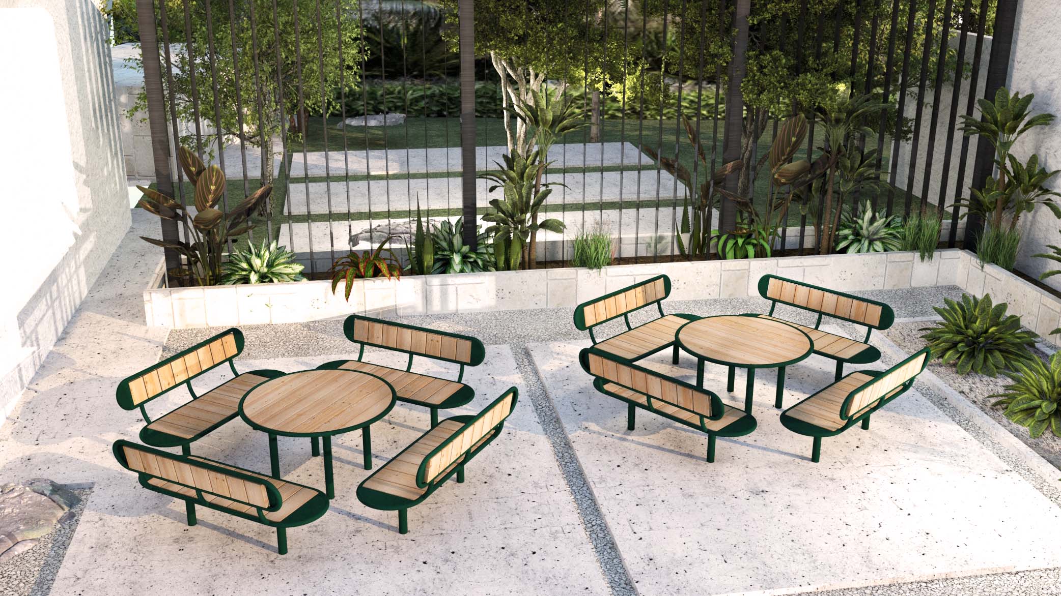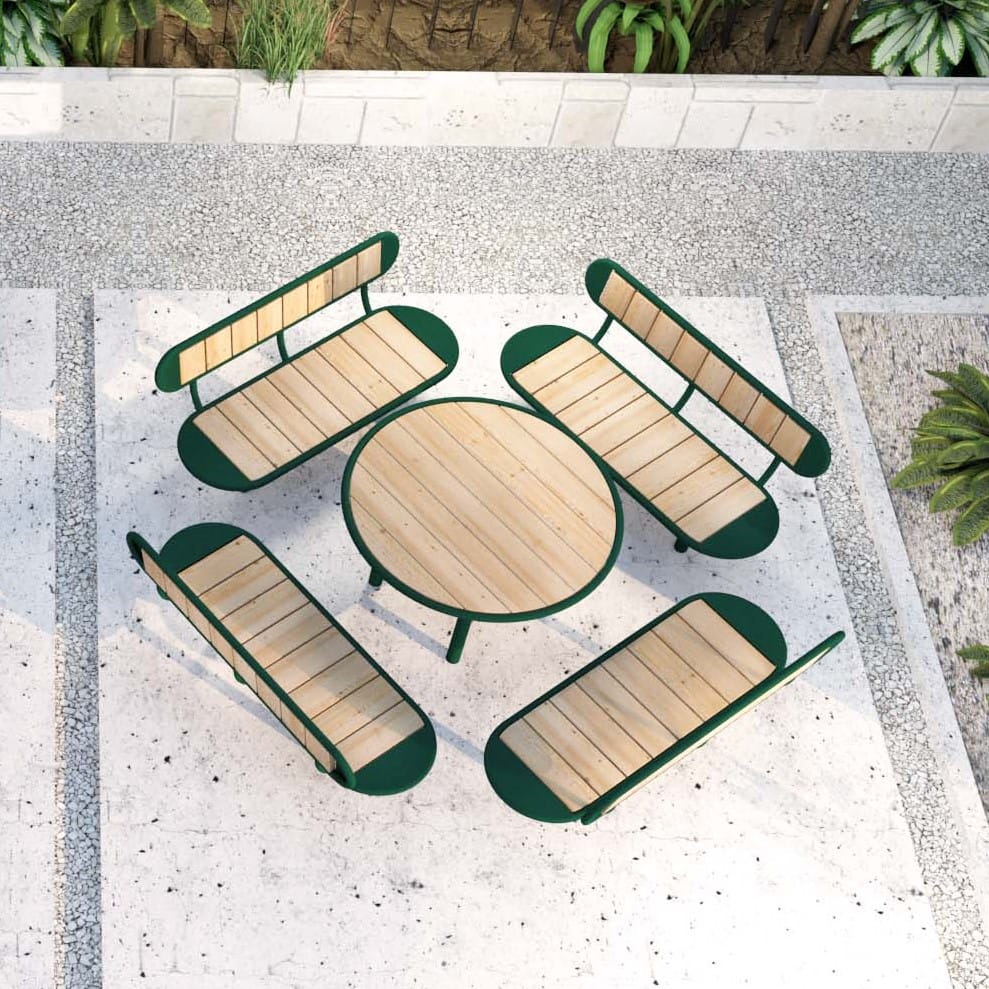 Produkty z serii Nordhavn to minimalistyczne i funkcjonalne rozwiązania do przestrzeni miejskiej. Prezentowany zestaw stół i ławki idealnie sprawdzi się jako stół piknikowy. W skład zestawu wchodzi okrągły stół na czterech nogach oraz cztery ławki z oparciem. Meble są wykonane ze stali malowanej proszkowo. Siedziska i oparcia ławek oraz blat stołu to drewno modrzewiowe.